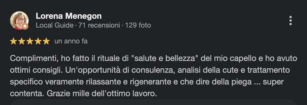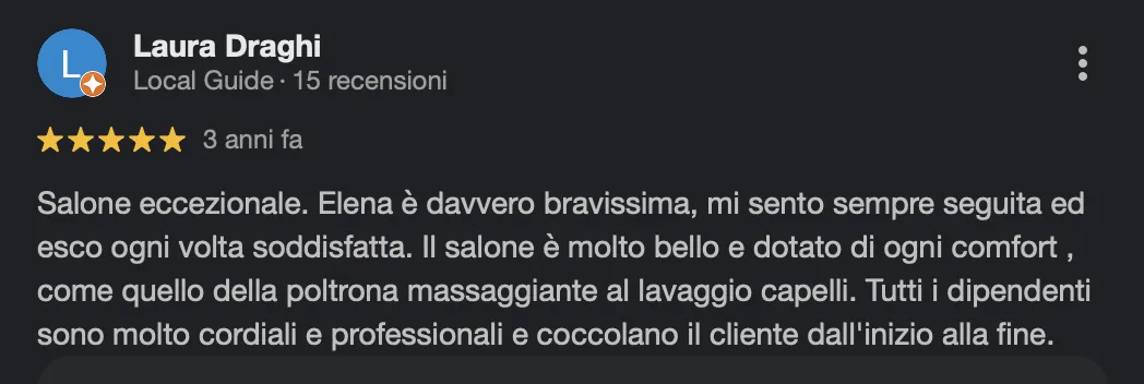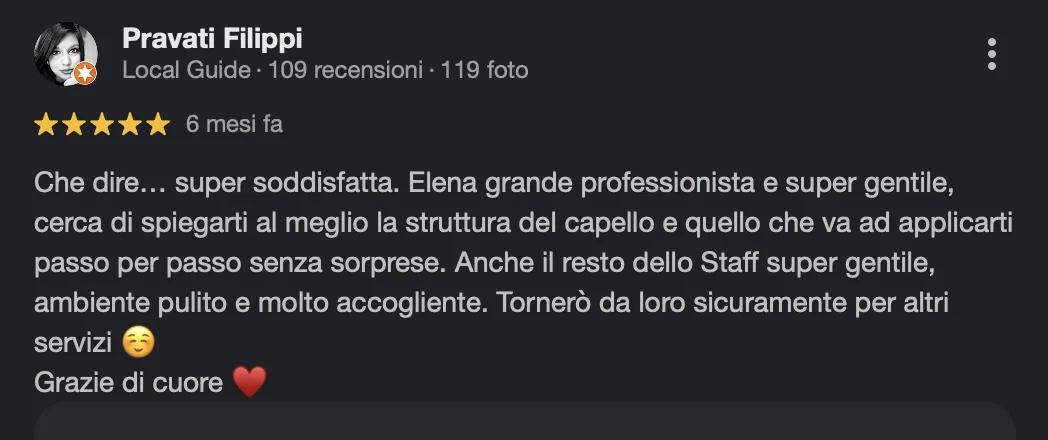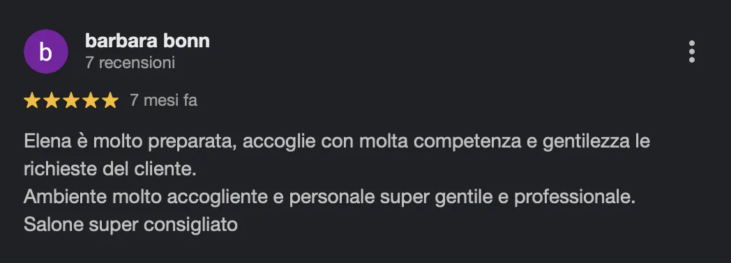 “Salone eccezionale. Elena è davvero bravissima [...] Tutti i dipendenti sono molto cordiali e professionali e coccolano il cliente dall’inizio alla fine”